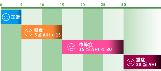 睡眠1時間あたり10秒以上の無呼吸・低呼吸(呼吸が浅く・弱くなる)状態が発生する回数を示す指数を「無呼吸低呼吸指数/AHI:Apnea Hypopnea Index」といいます。この指数によって重症度を分類します。